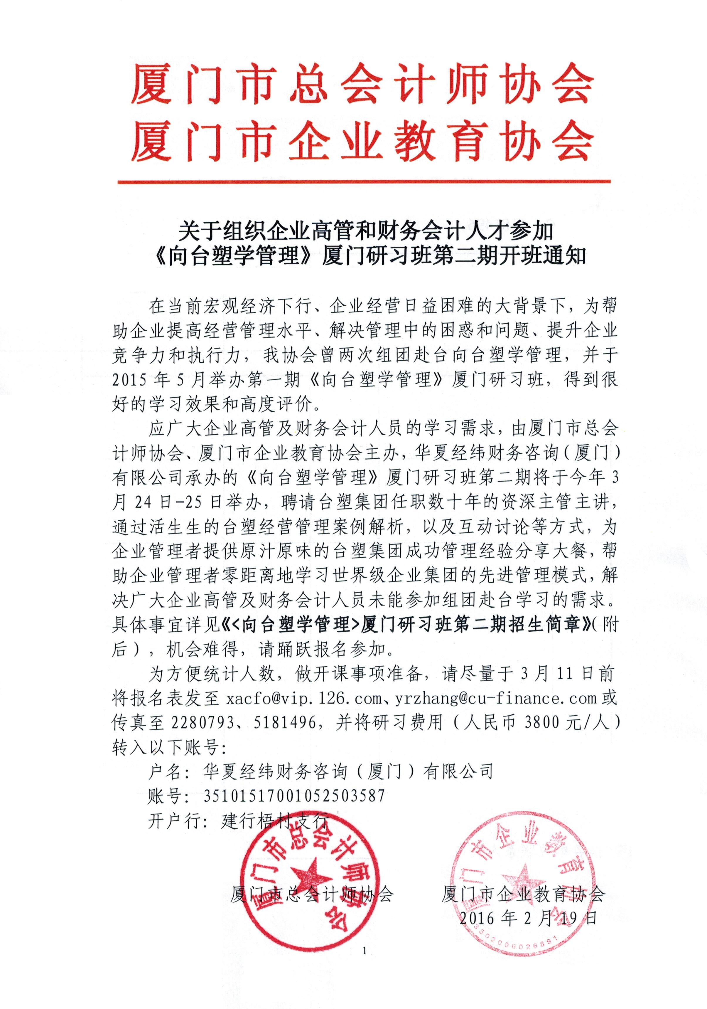 關(guān)于組織企業(yè)高管和財務(wù)會計人才參加《向臺塑學(xué)管理》廈門研習(xí)班第二期的通知